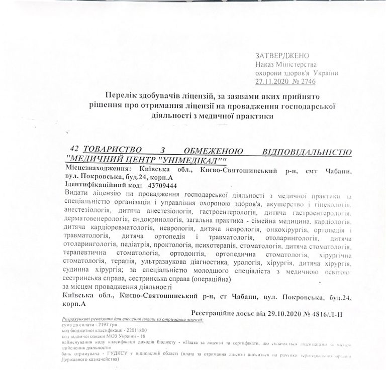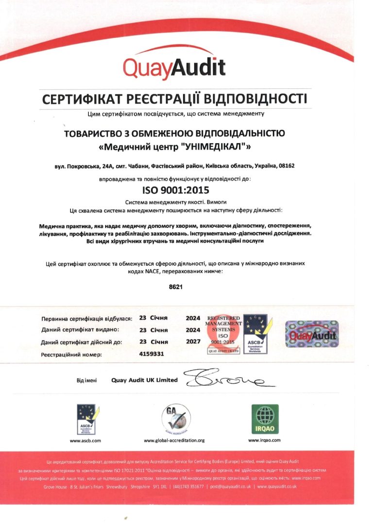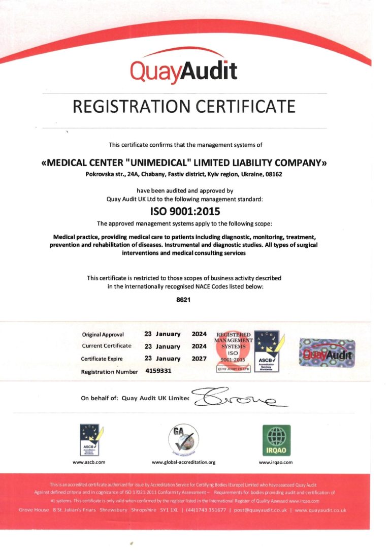 У 2024 році медичний центр "Унімедікал" отримав міжнародний сертифікат якості ISO 9001:2015, що підтверджує наші високі стандарти у наданні медичних послуг. Цей сертифікат є визнанням нашого прагнення до постійного вдосконалення якості обслуговування, безпеки пацієнтів та ефективності процесів. Він підтверджує, що наші пацієнти отримують медичну допомогу відповідно до найкращих міжнародних стандартів.