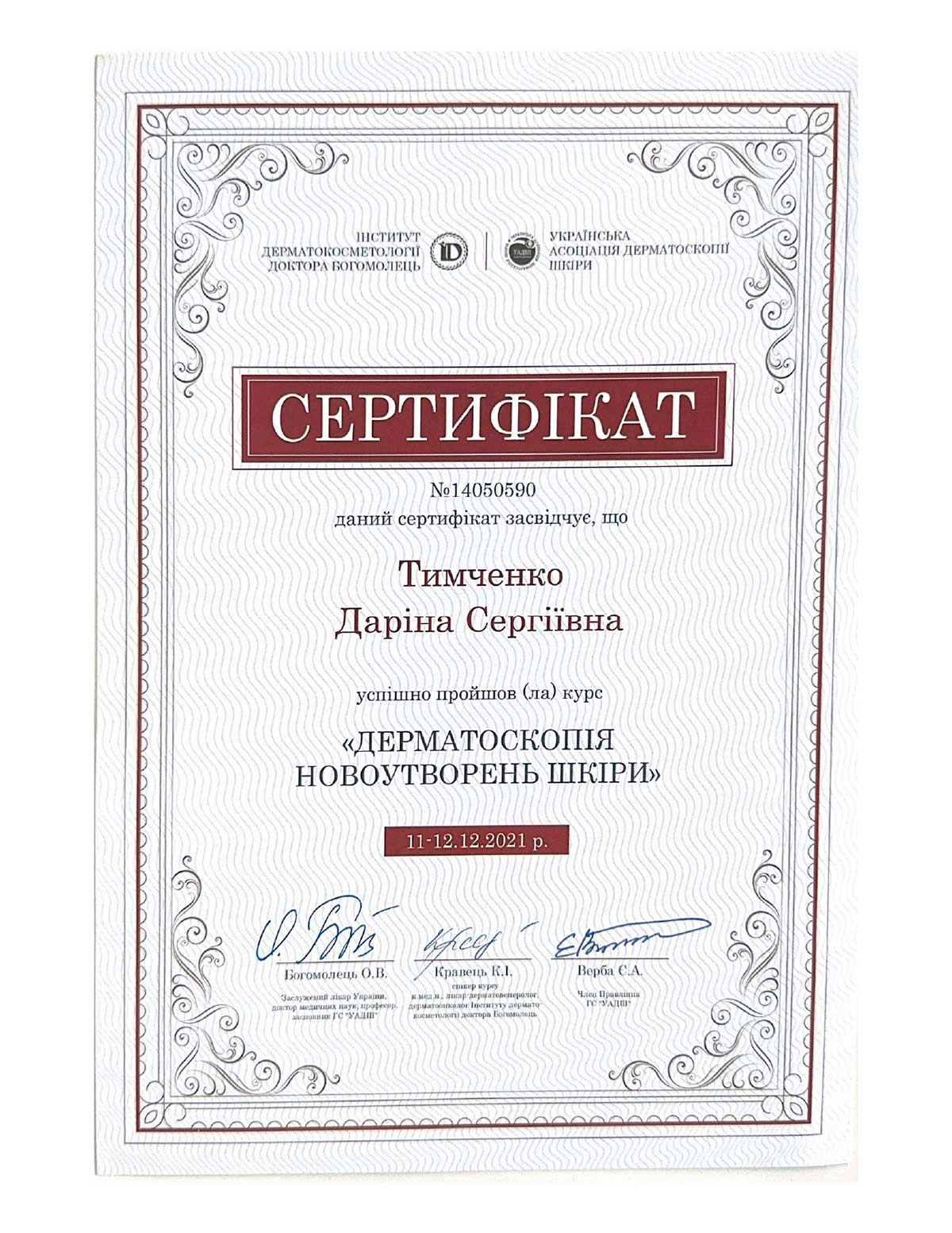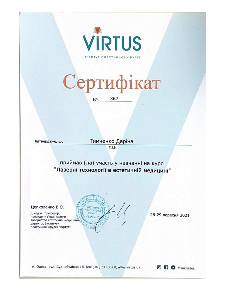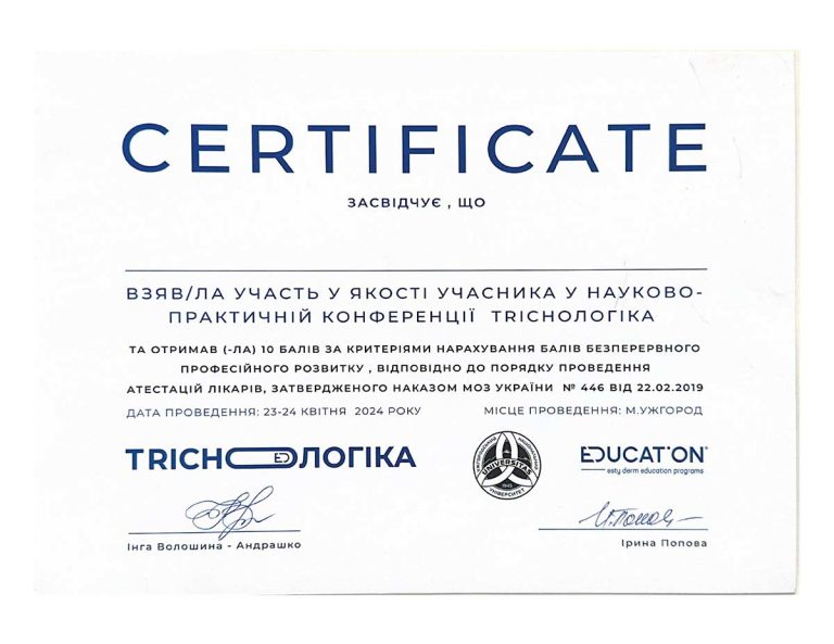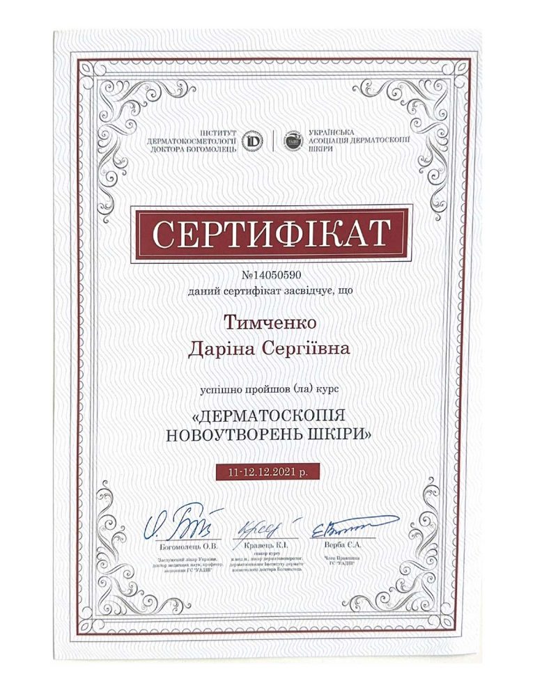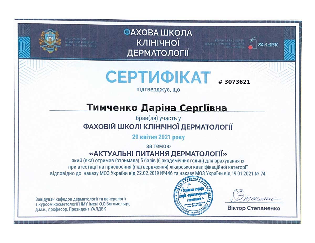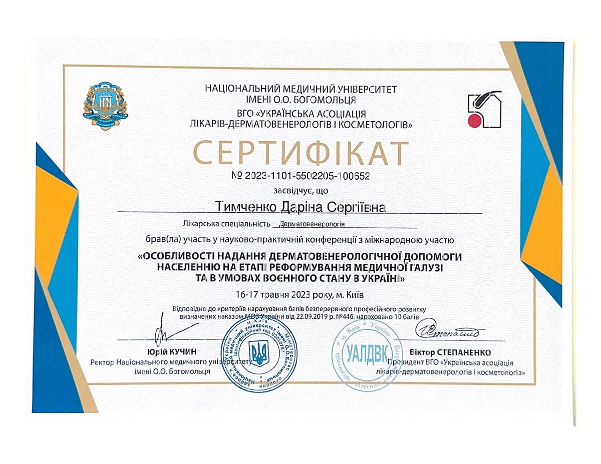 - Національна медична академія післядипломної освіти ім. П.Л. Шупика, спеціалізація «Дерматовенерологія»
