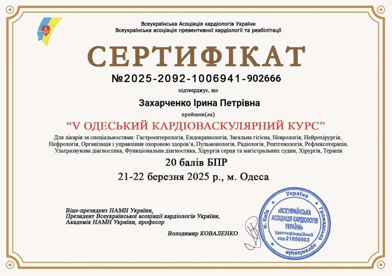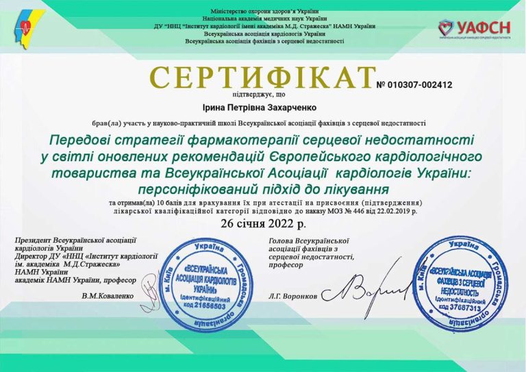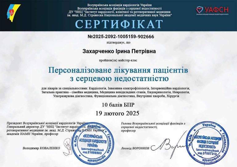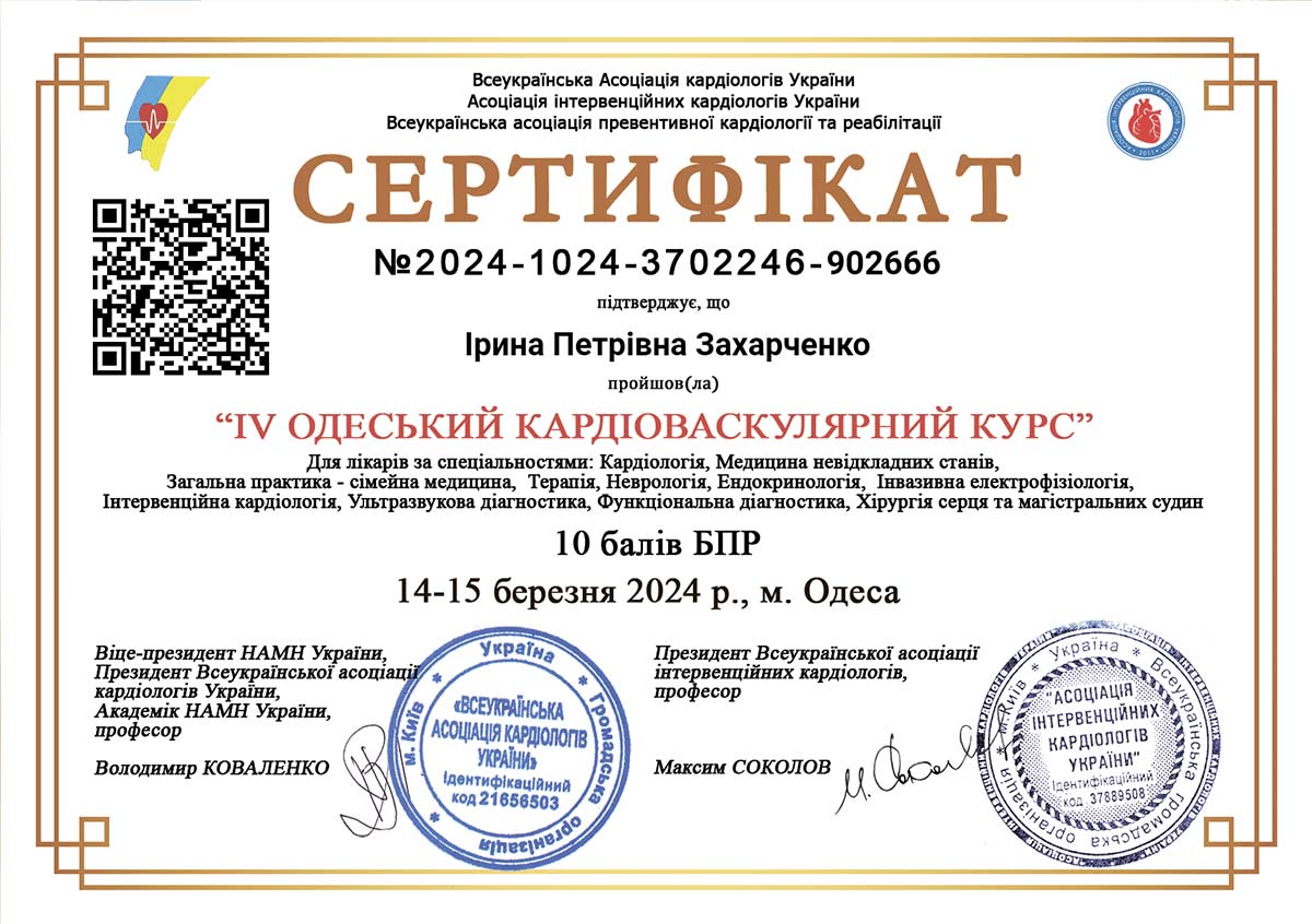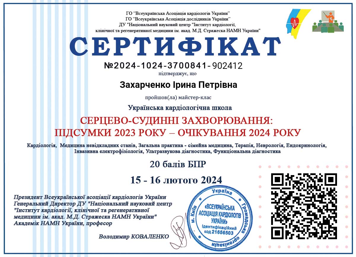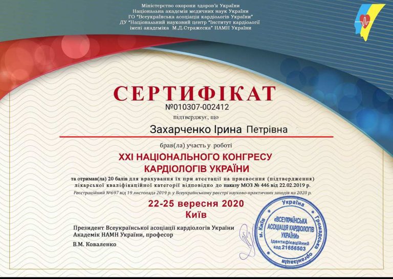 - Вища кваліфікаційна категорія з кардіології з 1990 р.